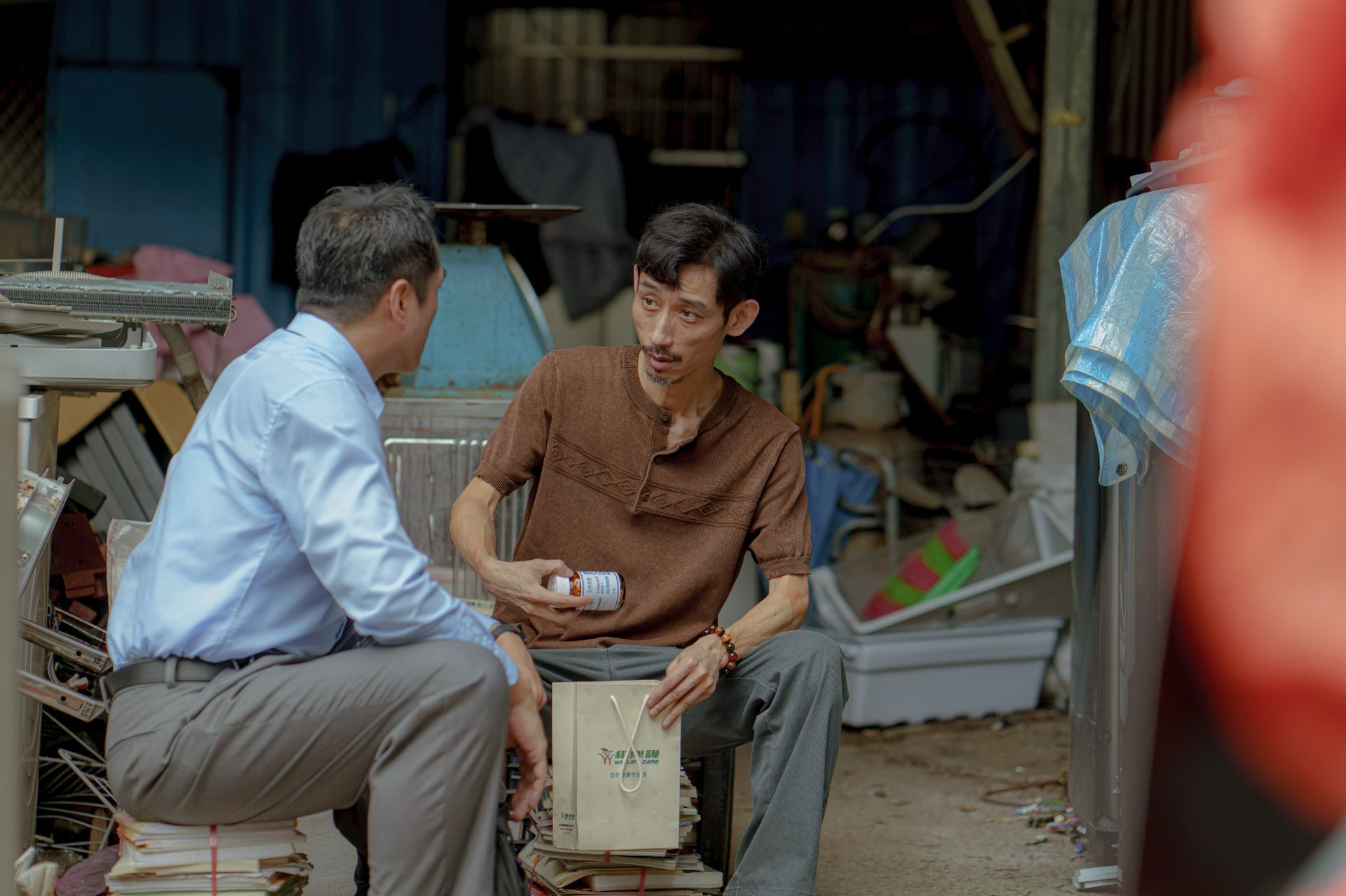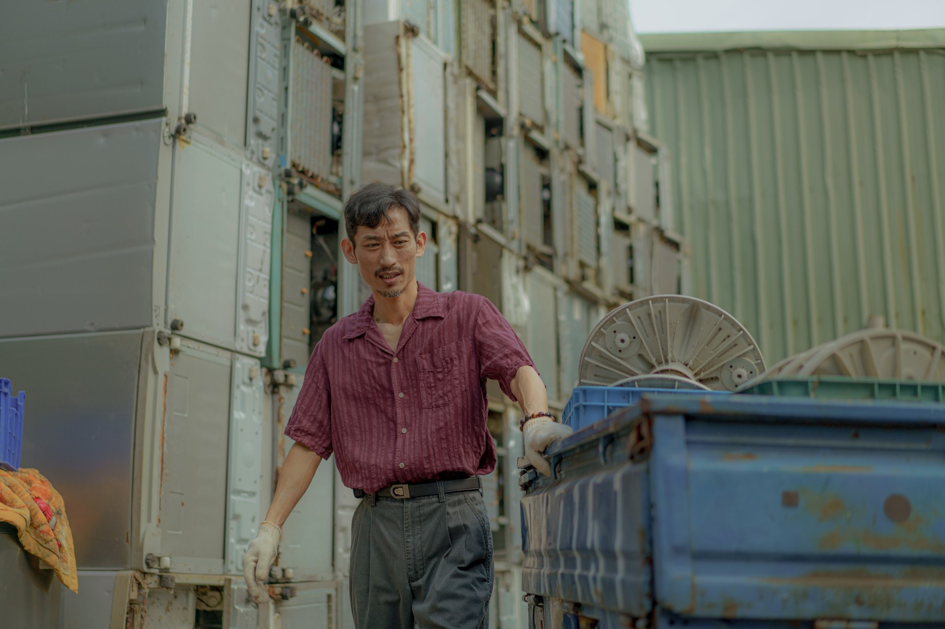 陳竹昇閉上眼,一邊描述腦海中的90年代,一邊想像他所飾演的「萬欽」。劇本沒寫到的細節,他發揮三十多年的表演功力,在腦內劇場裡一一補上:「萬欽為什麼會去撿回收?這是不是他在進工程界之前的老本行?他在工班裡是開怪手的,回收業同樣也有人在開怪手,啊!原來是這樣。」他在心中為萬欽寫下一份自傳,把角色從職業、年齡到嗜好,一點一滴捏成型。